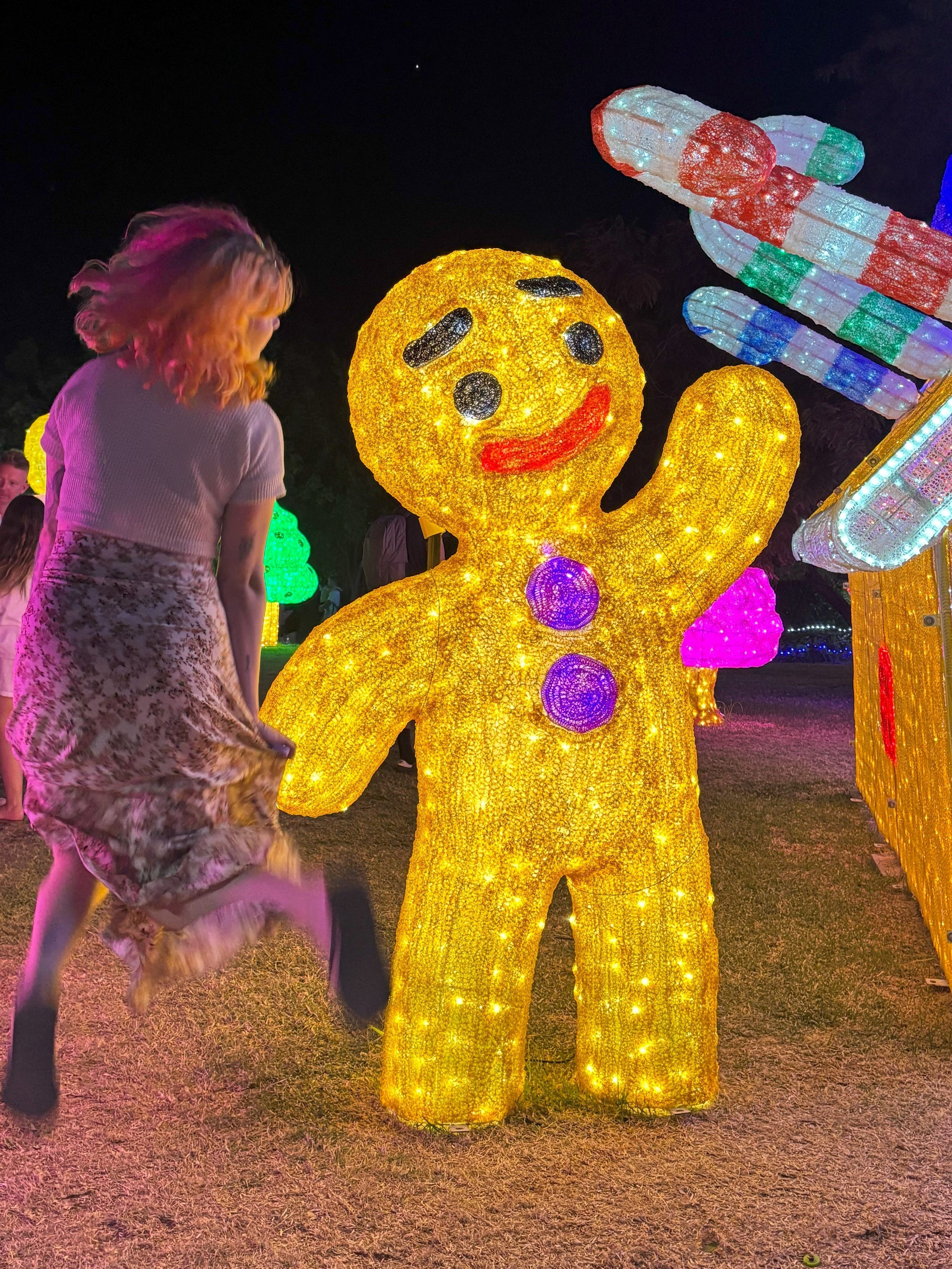 As we were walking around I noticed there were quite a few themes to the lights as well. Obviously there were the classic baubles, bells and presents. But there were also Australian-themed Christmas displays, like kangaroos pulling Santa’s sleigh instead of reindeer. There were mushrooms, fairies and butterflies in the classic Story Book Garden, and we can’t forget the famous Christmas characters like the Grinch, Gingerbread Man, and Mr and Mrs Claus! The team really went all out for this year’s Christmas Lights Spectacular, and it definitely shows.