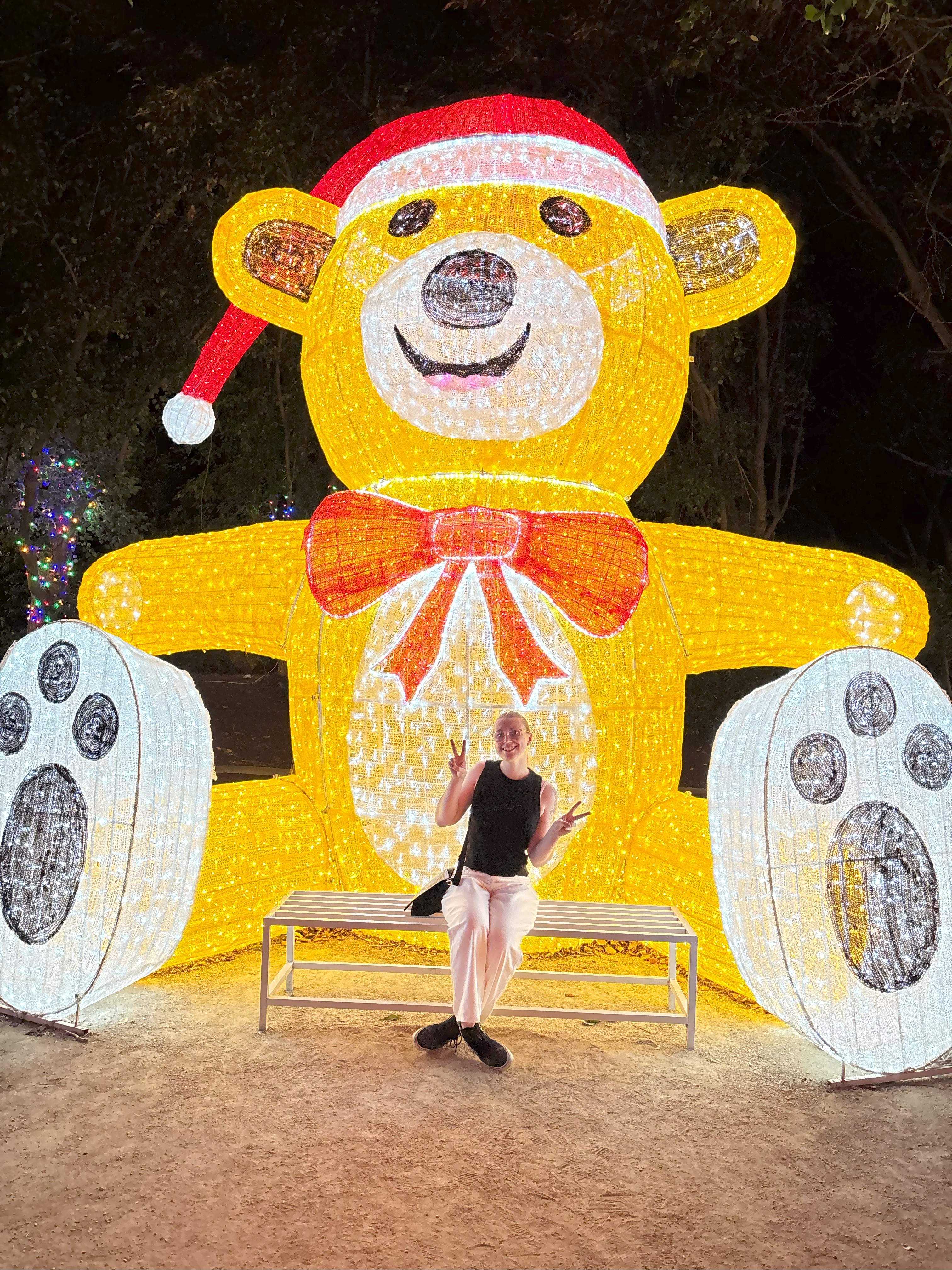 Now it is a lights display, but they had much much more! There was a whole row of food stalls to choose from depending on your sweet or savoury cravings. They also had several rides with varying levels of screams from each one. And let’s not forget the Santa photos! I tried to convince my brother to get one with me for nostalgia, and he was almost on board until we saw the line. Lucky for us there were plenty of other photo opportunities with the lights, so we got one in front of Santa playing cricket instead. Plus, this photo was free! Well if you don’t count the entry fee to the gardens… My family and I had a lot of fun taking photos with all the lights, and it makes me really happy to know that I’m not as scared of cameras as I was before. My anxiety has really improved this year and I honestly believe it’s because of this blog and putting myself out there. Plus my brother’s girlfriend is a great hype woman behind the camera! As much as she is tease.